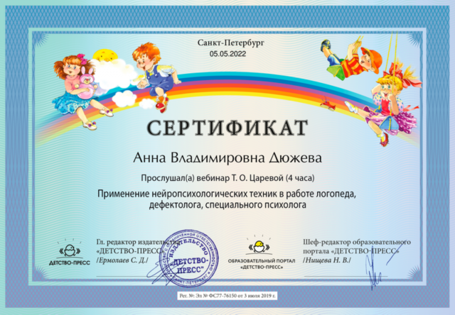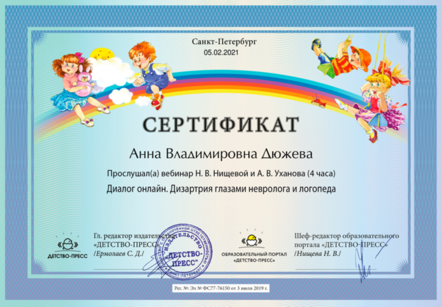 Образование: ЛГУ им. А.С. Пушкина, специальность – логопедия (2002 г.)