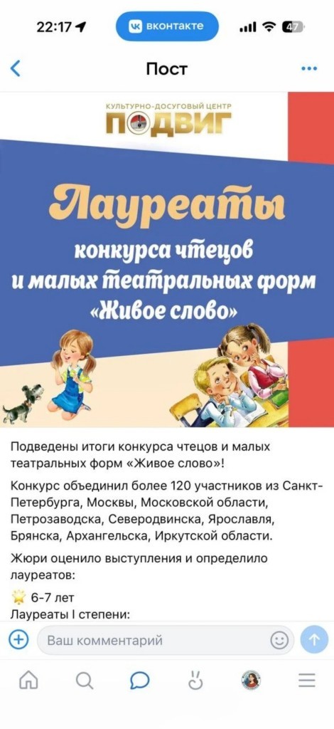 Поздравляем наших ребят из группы N 2 с ПОБЕДОЙ в конкурсе чтецов "Живое слово", посвящённый стихами Агнии Барто! Георгий Ш. - ЛАУРЕАТ 1 СТЕПЕНИ!  Олеся Н. и Рома С. - ЛАУРЕАТЫ II СТЕПЕНИ!  Видео выступлений Вы можете посмотреть, пройдя по ссылке! max.ru/id78170275... Этот конкурс — замечательная возможность проявить свои таланты и показать, как красота слова может тронуть сердца ЛЮДЕЙ. И это получилось благодаря трудолюбию и стремлению к самовыражению, что заслуживает самых искренних похвал. Выражаем благодарность родителям и педагогам, которые подготовили на высоком уровне ребят!   Желаем вам удачи и заслуженных аплодисментов! #ГБДОУдетскийсад34КолпинскогорайонаСПб #ГБДОУдетскийсад34Колпино | |